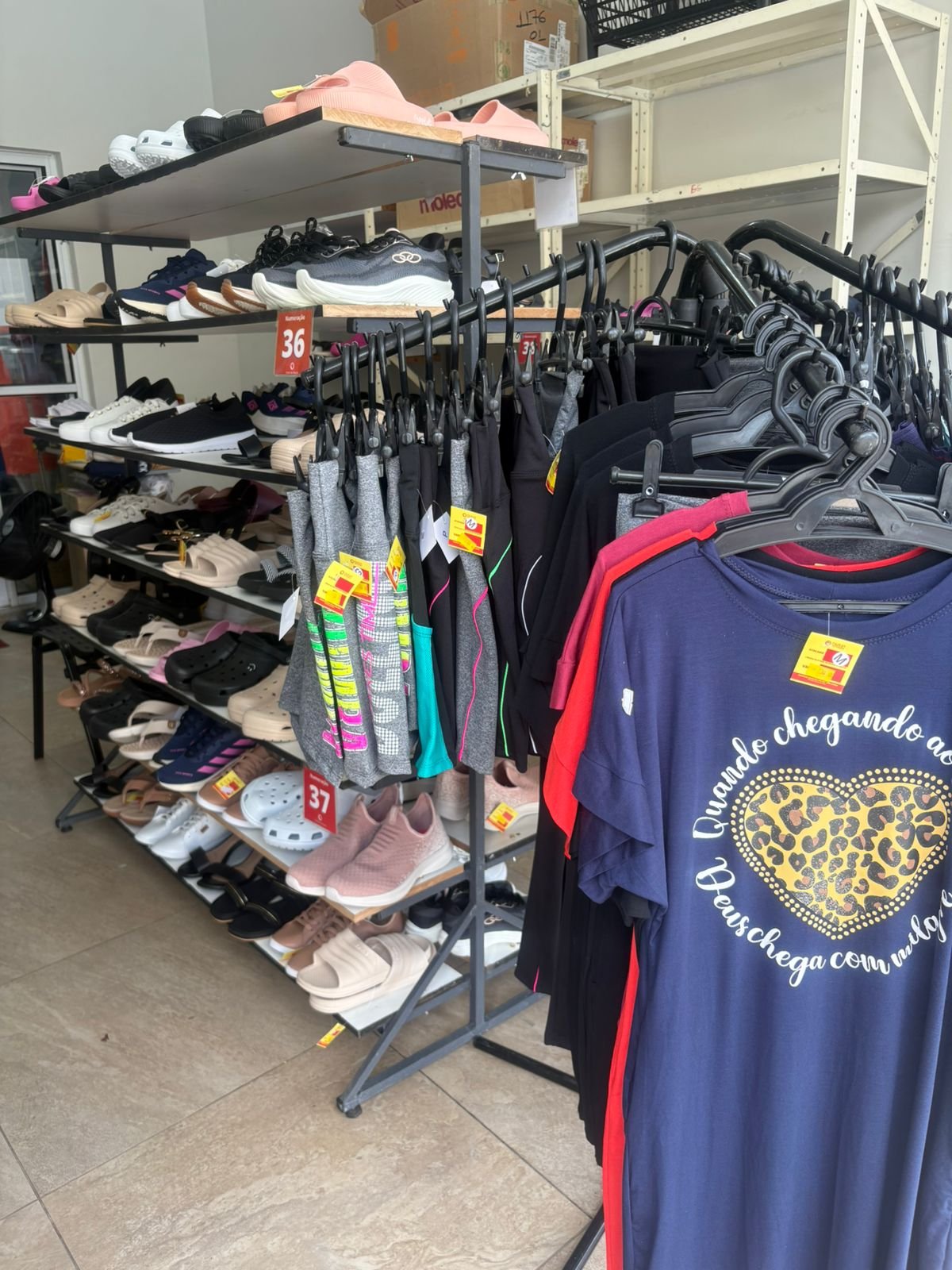 Um dos espaços recebe o saldão de calçados novos e roupas fitness, com produtos de marcas reconhecidas como Moleca, Modare, Beira Rio, Vizzano, Olympikus e Piccadilly. Os visitantes encontram diversas opções com condições especiais de pagamento, incluindo parcelamento em até três vezes sem juros.