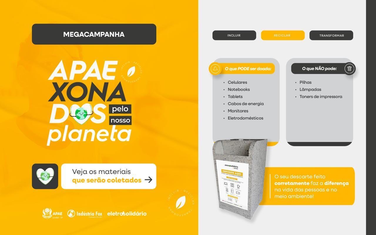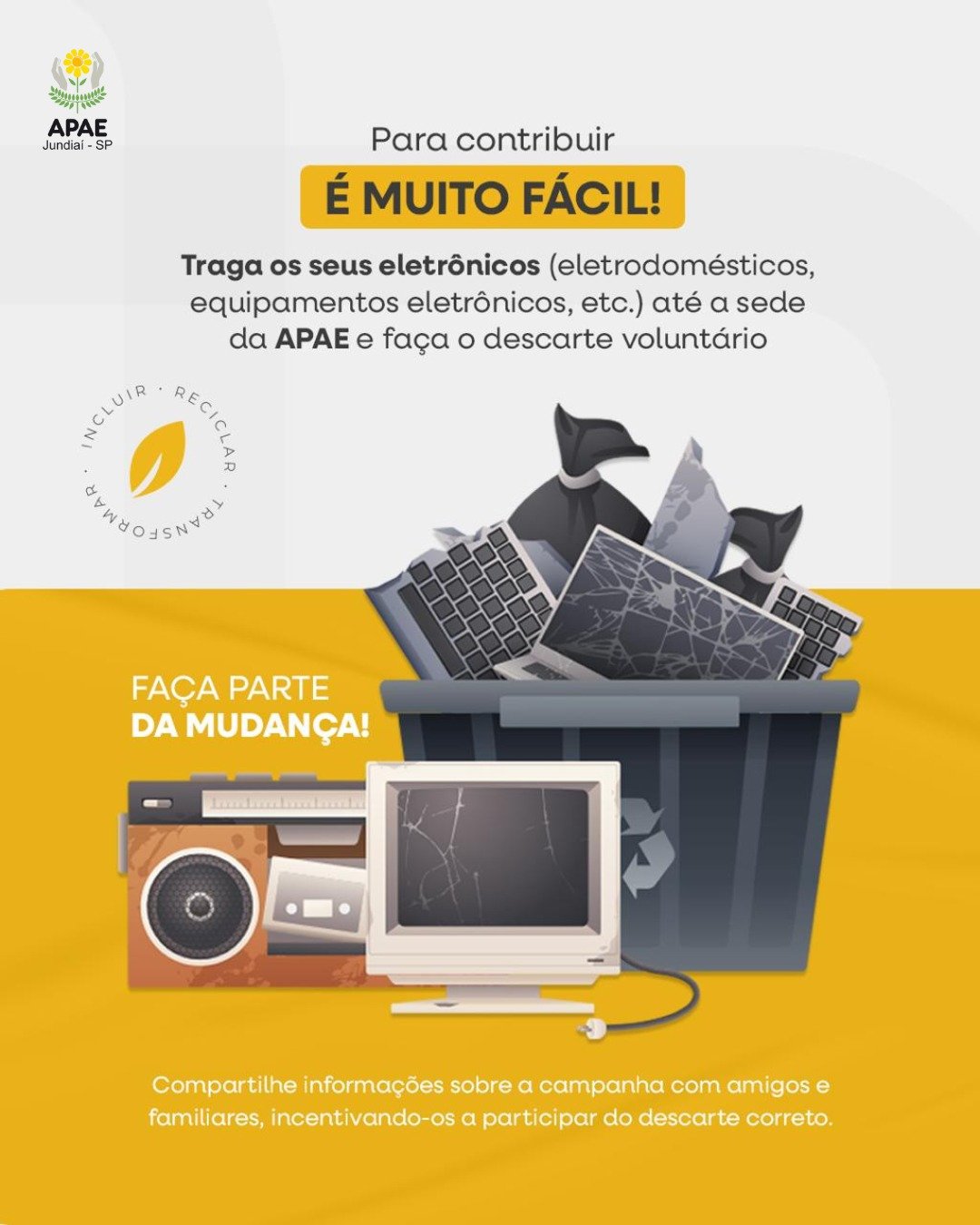 A APAE de Jundiaí promove nesta semana a campanha “Apaexonados pelo nosso planeta”, com o objetivo de incentivar o descarte correto de equipamentos eletroeletrônicos, contribuindo para a preservação do meio ambiente e gerando recursos em prol da instituição.